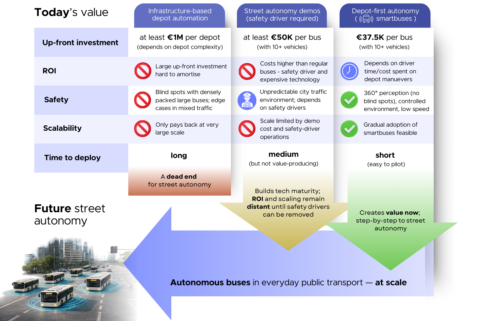 The comparison summarises the trade-offs across up-front cost, time to deploy, safety envelope, scalability, and where (or whether) ROI shows up during the learning phase. Smartbuses – buses equipped with technology for autonomous movements inside the depot – make the adoption trade-offs simpler and more actionable in three ways: