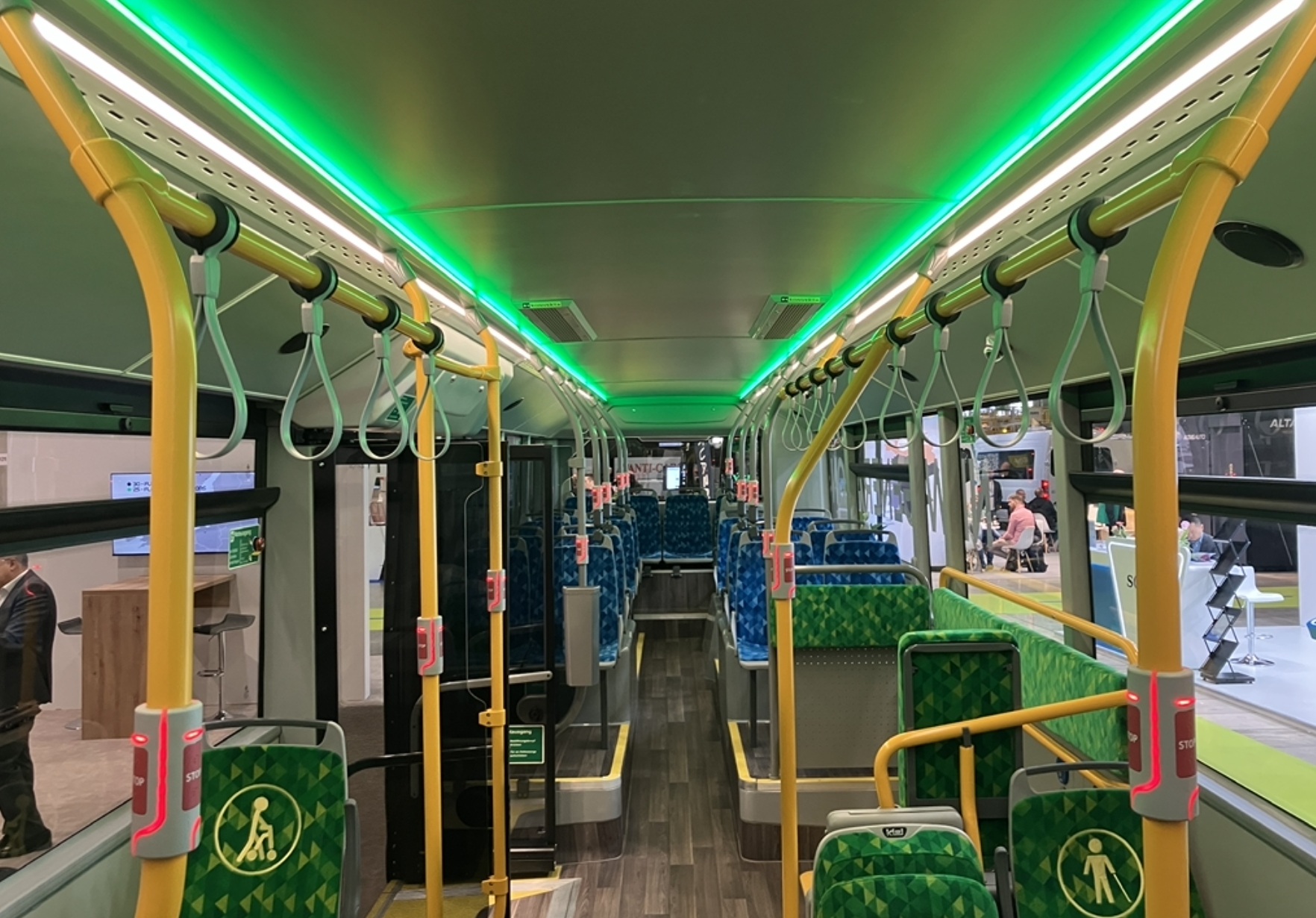 The vehicle interior is configured according to the “Easy Bus” concept, with specific design elements aimed at passenger guidance and accessibility. Visual guidance is provided through yellow floor markings directing passengers with reduced mobility toward designated seating areas.